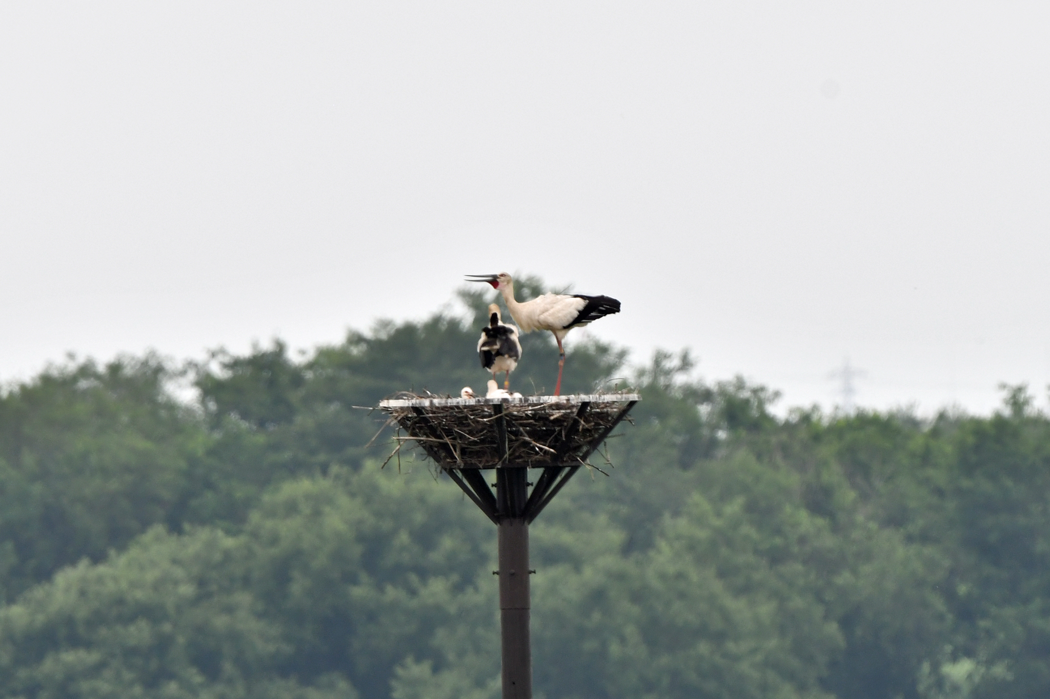 遊水地に設置してある巣塔には、ここで自然繁殖したコウノトリ(Oriental Stork)一家のお母さん(歌、2歳)と2羽のヒナがいました。